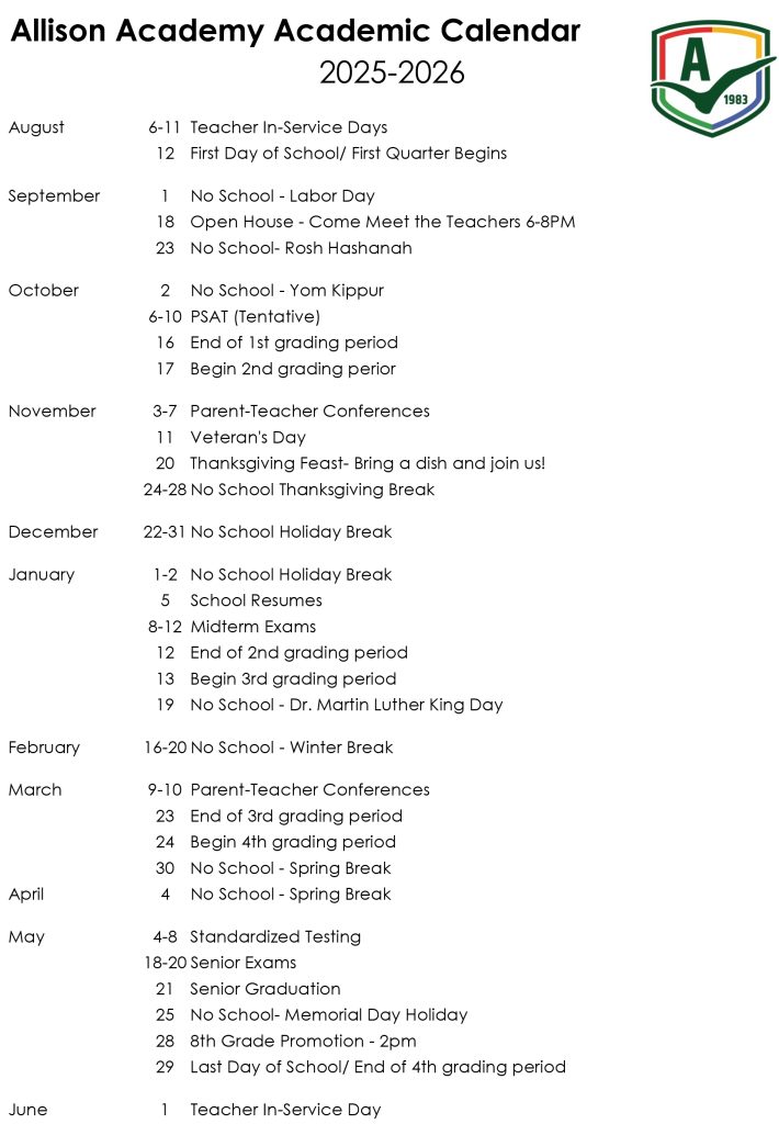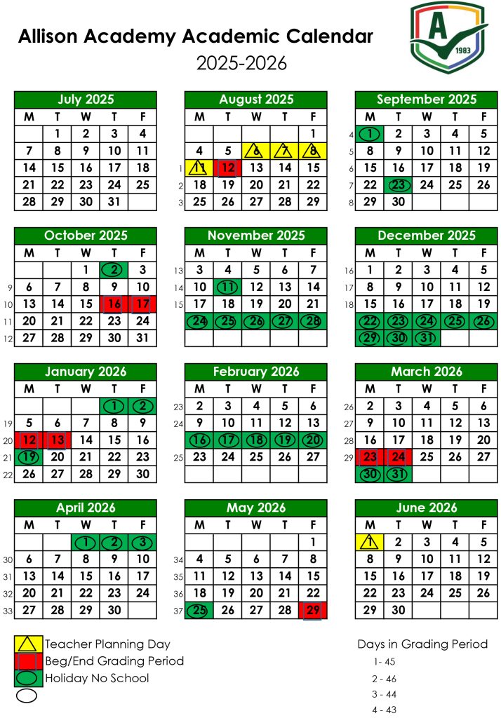 At Allison Academy it is our goal to help every student, parent, and staff member keep track and stay-on-top of everything they have to do. You will find everything on our calendar from the first day of classes and Labor Day to the beginning of spring semester and final exam dates. You will also find the last day of school and the beginning of summer vacation as well!